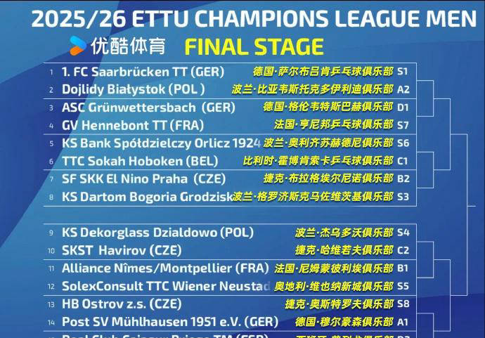 中国球员在欧冠签表中的分布情况备受关注。樊振东加盟德国萨尔布吕肯俱乐部,林高远代表德国穆尔豪森邮政参赛,周启豪、陈垣宇、温瑞博则齐聚法国亨内邦俱乐部。首轮比赛中,樊振东所在的萨尔布吕肯队将迎战波兰比亚韦斯托克,若晋级,很可能与拥有三名中国球员的法国亨尼邦俱乐部相遇,预示着乒乓球欧冠赛场可能上演中国德比。林高远和樊振东分属不同半区,只有在决赛才有可能对阵。