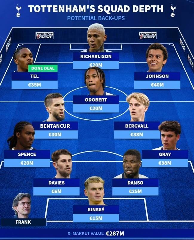 本赛季能排第几?德转列热刺两套阵容:哈维-西蒙斯领衔5名新援