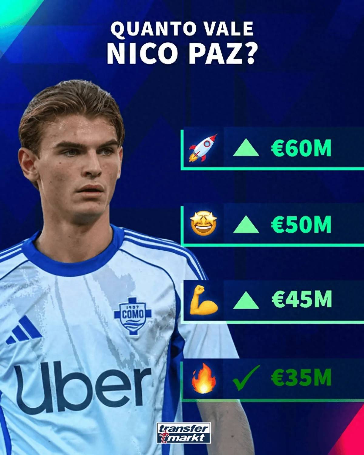 9月16日,德国转会市场更新数据显示,效力于意甲科莫队的阿根廷新星尼科-帕斯即将迎来身价暴涨。这位21岁的中场球员当前身价为3500万欧元,但最新评估显示其最高估值可达6000万欧元,涨幅接近翻倍。